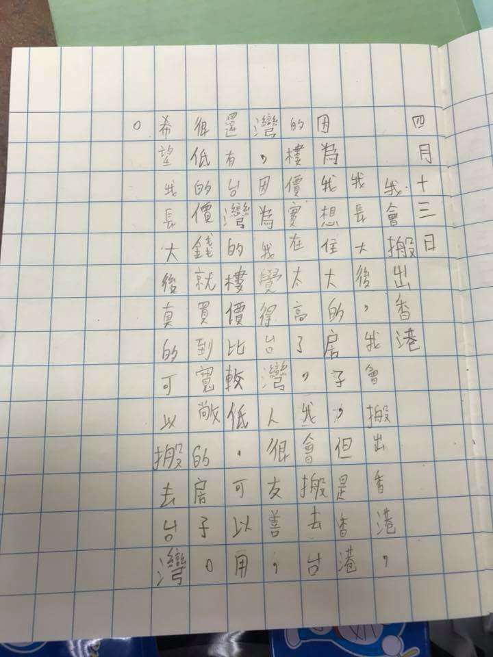 ▼香港網友表示,自己在義教時,一位小五生寫下隨筆:「我會搬出香港,因為我想住大的房子,但是香港的樓價實在太高了,我會搬去台灣,因為我覺得台灣人很友善,還有台灣的樓價比較低,可以用很低的價錢就買到寬敞的房子。希望我長大後真的可以搬去台灣。」
