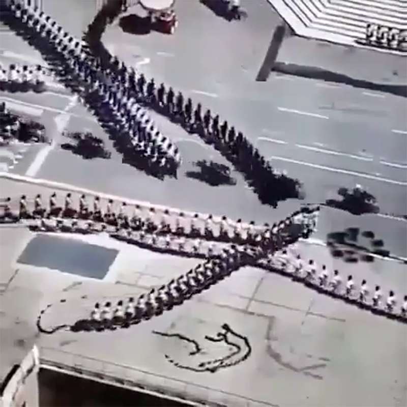 ▼網路上瘋傳一段影片,畫面中出現幾排人,正邁著整齊的步伐前進,不過不是統一向前走,而是朝不同的方向走,幾條隊伍不斷交織在一起,但是速度和隊形一點都沒有亂,看起來就像是穿透過去一樣。