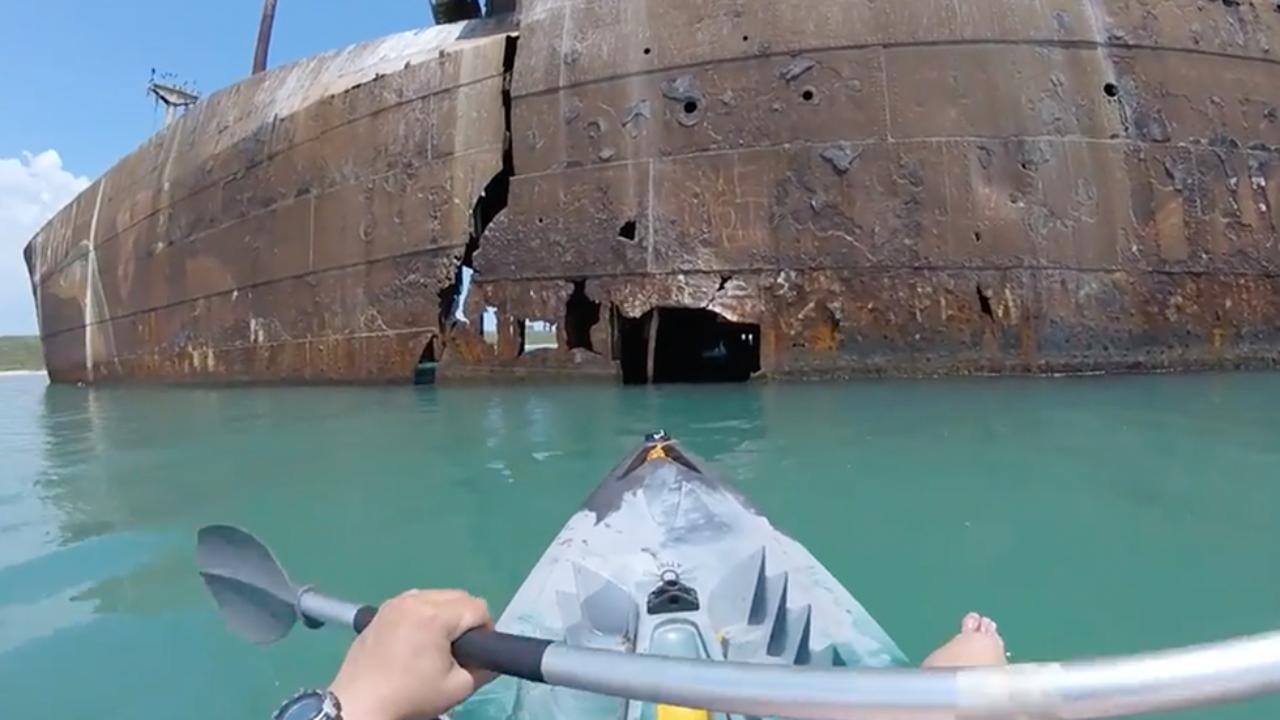 發現「二戰擱淺的船有一個小洞」大膽划進去 然後他就一直都不想出來了…