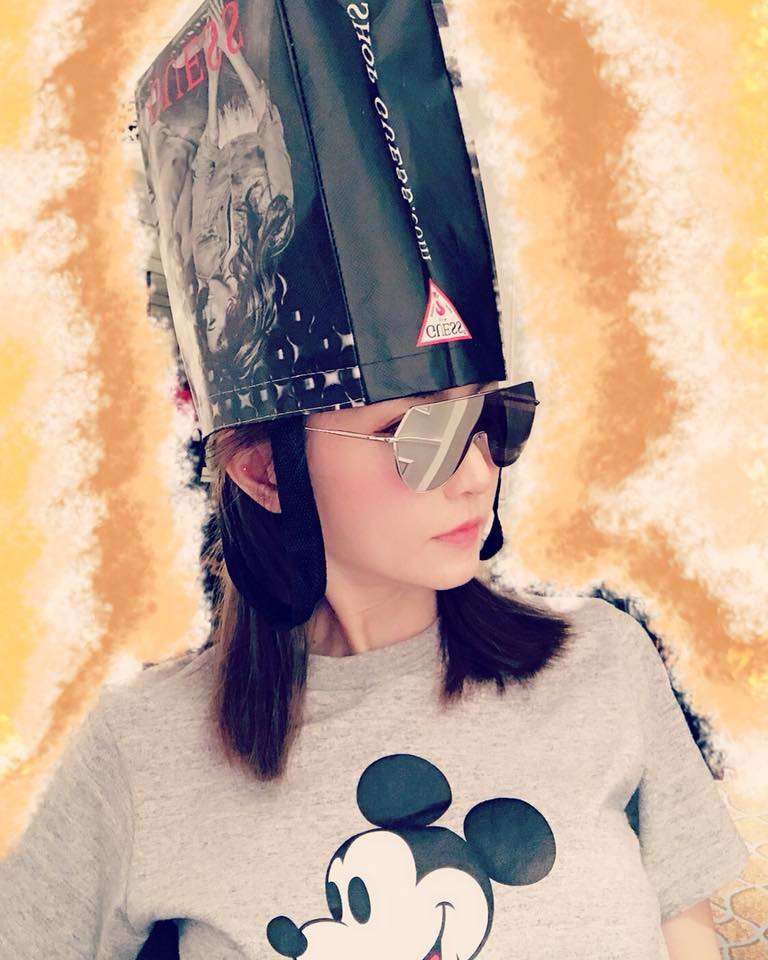 ▼從照片中可以看到,謝金燕將頭髮剪到鎖骨附近,身穿印有米奇圖案的灰色上衣,臉上戴著時尚墨鏡,頭上還戴著黑色名牌袋,袋子提把剛好掛在耳朵。她開玩笑說:「短髮+新帽子……時尚新高度。」