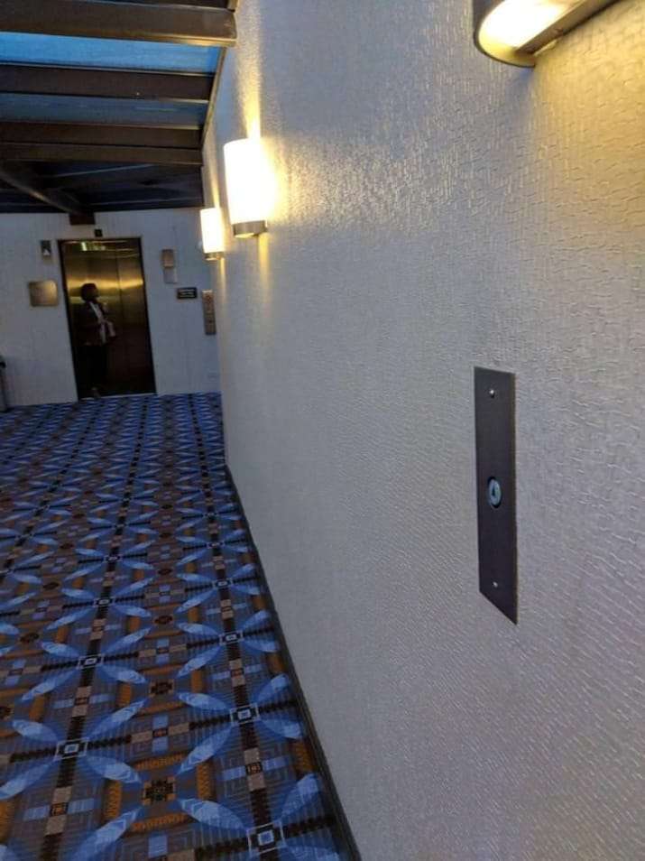 ▼電梯按鈕在走廊的牆壁上,按下後走到門口,電梯正好開門。