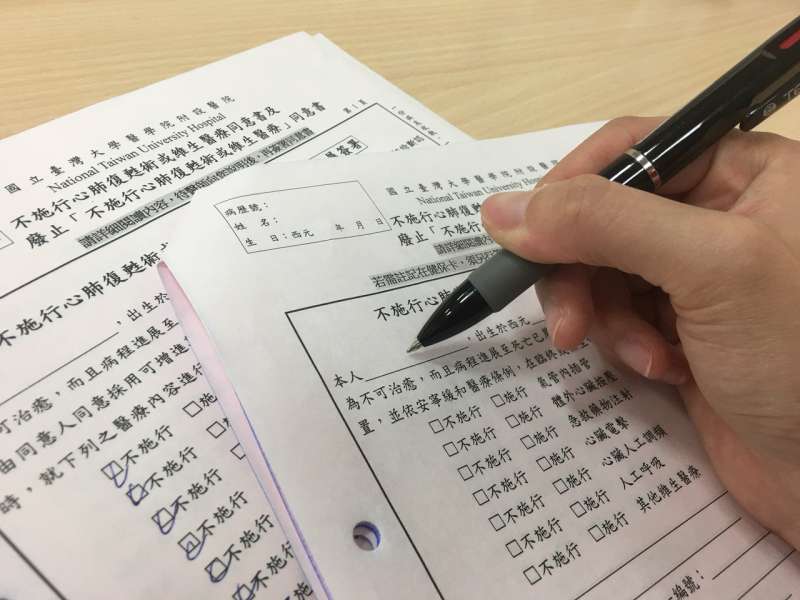 ▼在醫生和其他親屬的見證下,阿嬤親筆簽下「放棄急救同意書」(DNR:Do not resuscitate)。妹妹多次勸她繼續治療,她的想法都沒有改變。阿嬤表示,自己年紀大了,再治療也只是多痛苦幾個月而已。