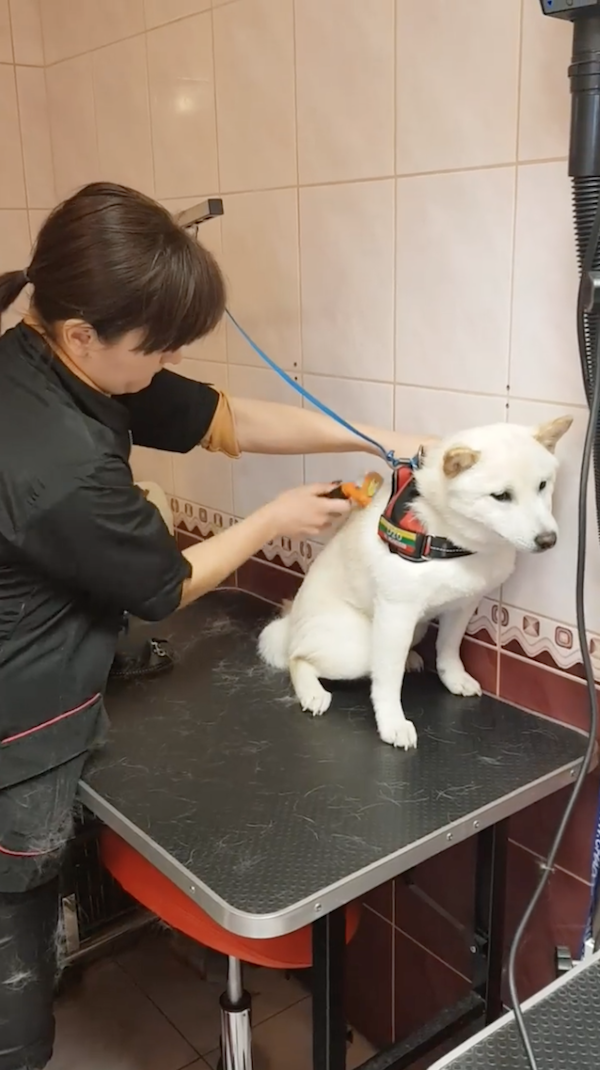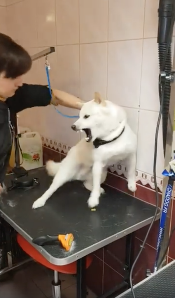▼立陶宛首都維爾紐斯的一間寵物美容店分享了這段影片,一開始,影片裡的白狗激動地想咬美容師,眼神也時不時流露出害怕的情緒,顯然是被陌生環境嚇到了。