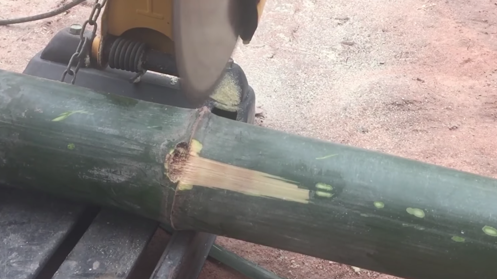 ▼把竹竿鋸成約六、七十公分的五個竹筒。