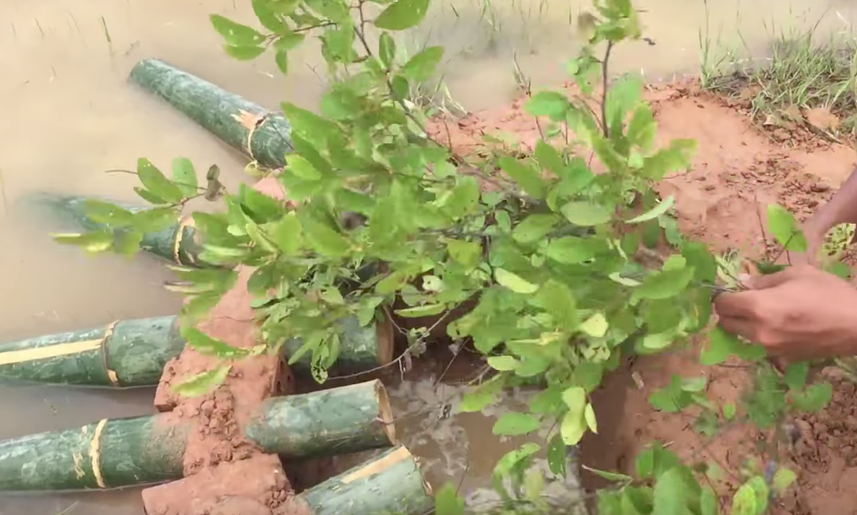 ▼用樹枝把洞的上面掩蓋起來,一個隱蔽的「捕魚陷阱」就做好了!