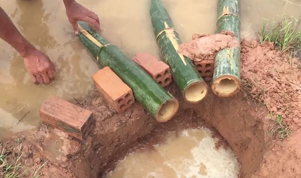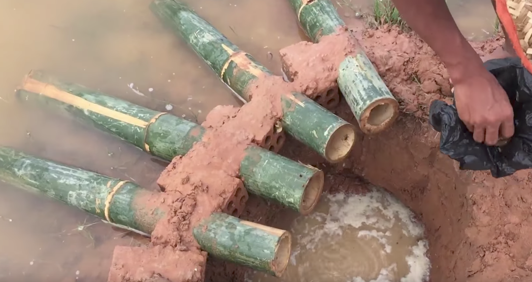 ▼把五個竹筒分散擺放在靠近水邊的洞口上,中間用四孔的木頭塊隔開,然後用泥巴固定好。