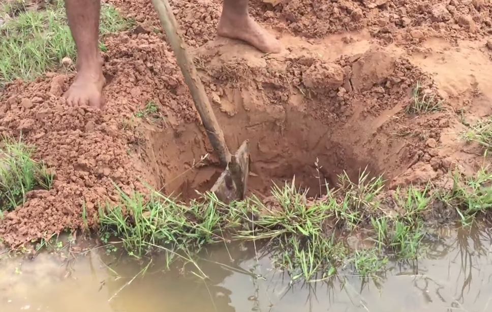 ▼先在池塘邊上找到一處地方,挖一個洞,作為「陷阱」。