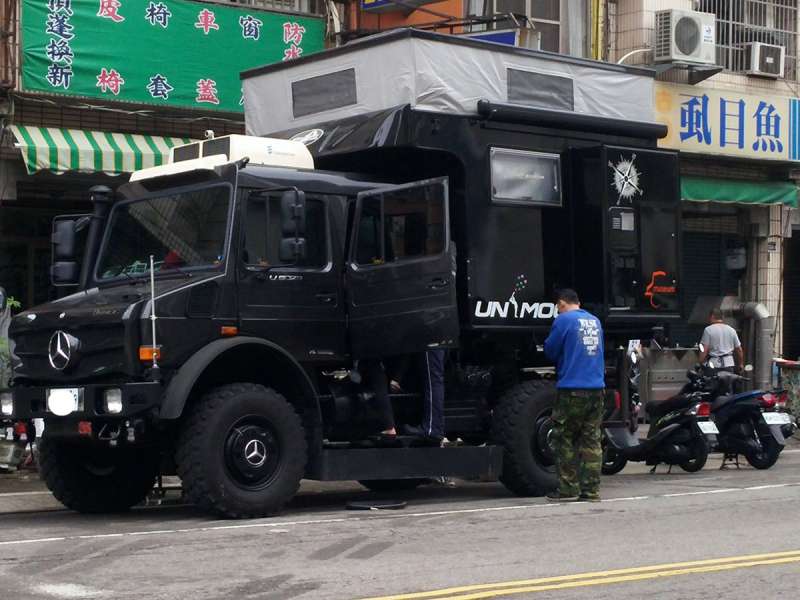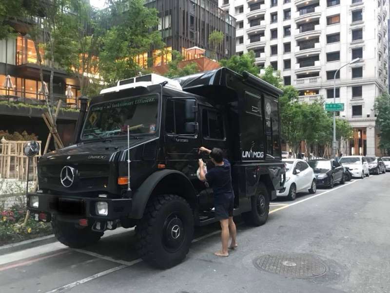 ▼黃姓網友表示他在台中市七期市政北二路附近看到這輛賓士霸王級越野露營車,地上的停車格已經被塞爆。巨大的輪胎和車體足以顯示自己的與眾不同,彪悍的越野性能和車身上Unimog的標記更是霸氣側漏。