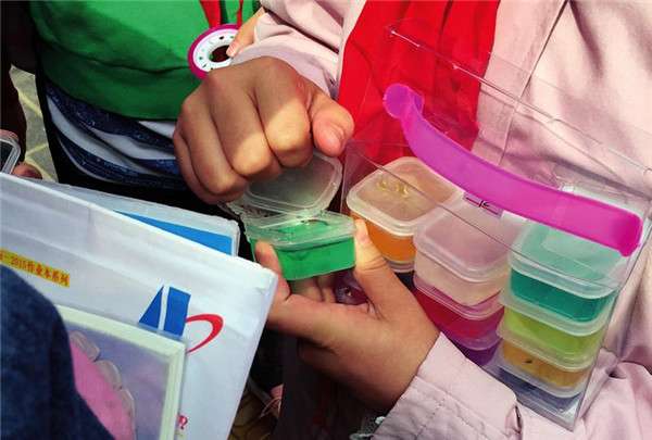 ▼「史萊姆」是黏液(Slime)的音譯,因為鮮亮的外表,柔軟光滑的質地,又稱「果凍泥」、「水晶泥」,深受中小學生的喜愛,在學校附近的文具店、小商販到處有售,不光有成品,還可以自己動手製作「史萊姆」,材料包括膠水、硼砂水、硼砂粉、白黏土及色素等。