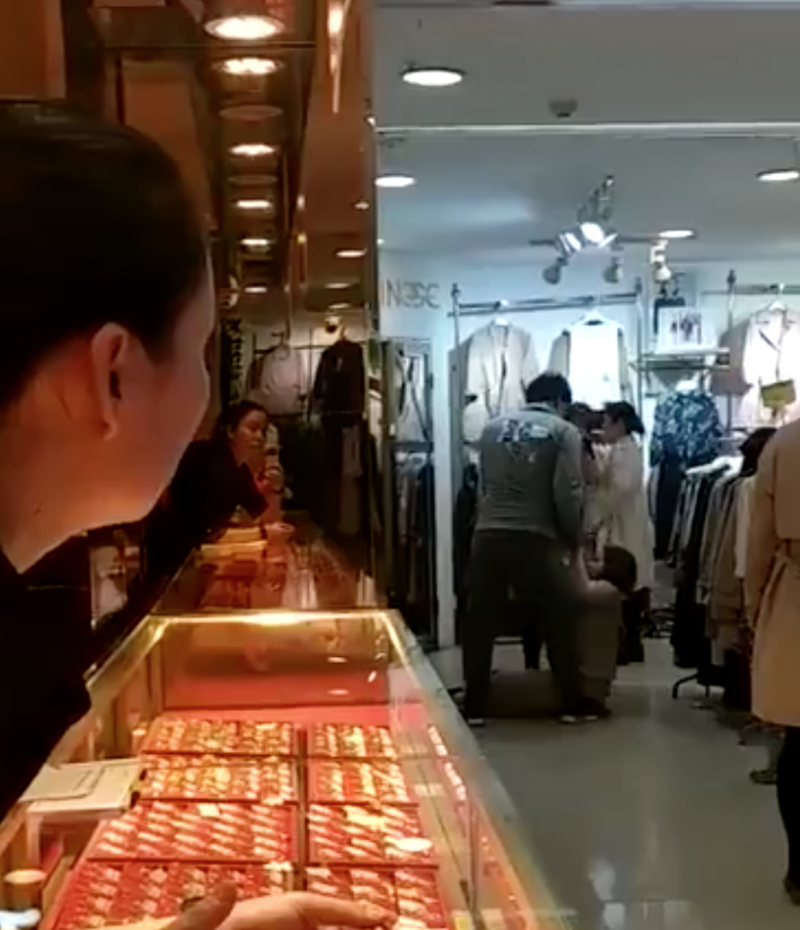 ▼旁邊的店員不停勸他們:「算了、算了!」還是無法阻止扭打,現場亂成一團。