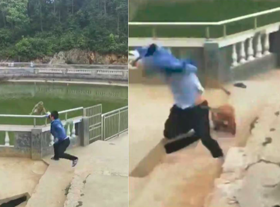 2018年04月26日日前,大陸一名男子到福建德化縣西天寺旅行,當時一隻猴子站在水邊的欄杆上,他悄悄接近,從後面狠狠推了一把,想將猴子推下水。沒想到幾秒鐘後,猴子又跳了回來。