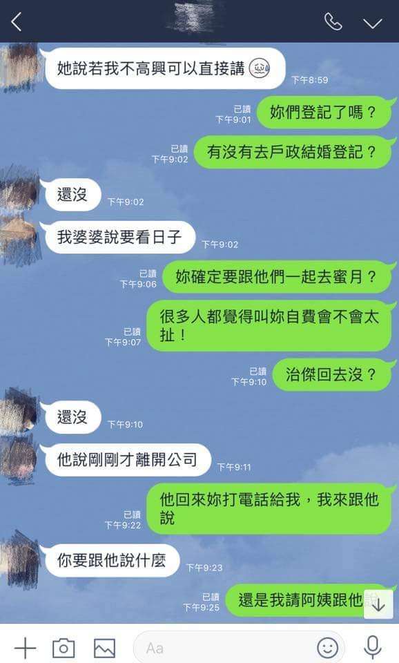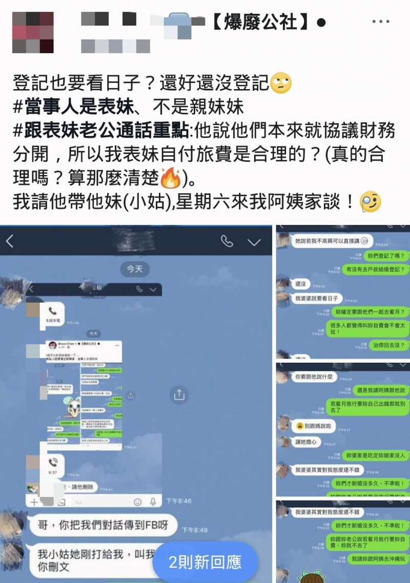 2018年04月26日跟老公蜜月旅行,婆婆、小姑要跟就算了,老公還叫她「自費」,事件被女方表哥知道後,相當不悅地將對話記錄放在臉書「爆料公社」後,當事者老公引發眾網友砲轟。