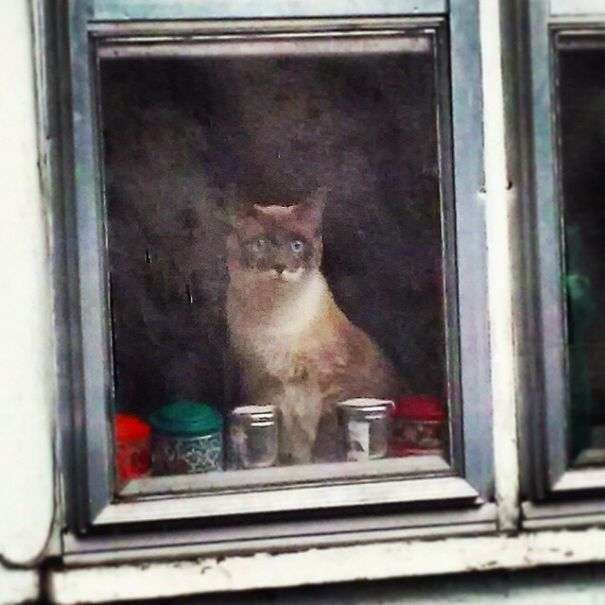▼​透過髒兮兮的窗戶拍攝裡面的貓咪,很像油畫。