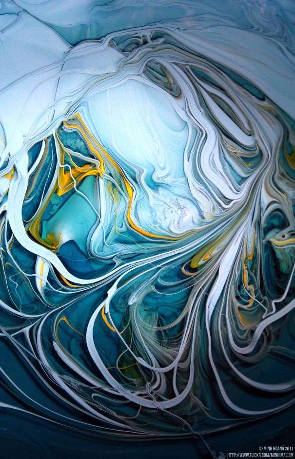 ▼​黃色、藍色油漆混合,還沒有攪拌均勻。