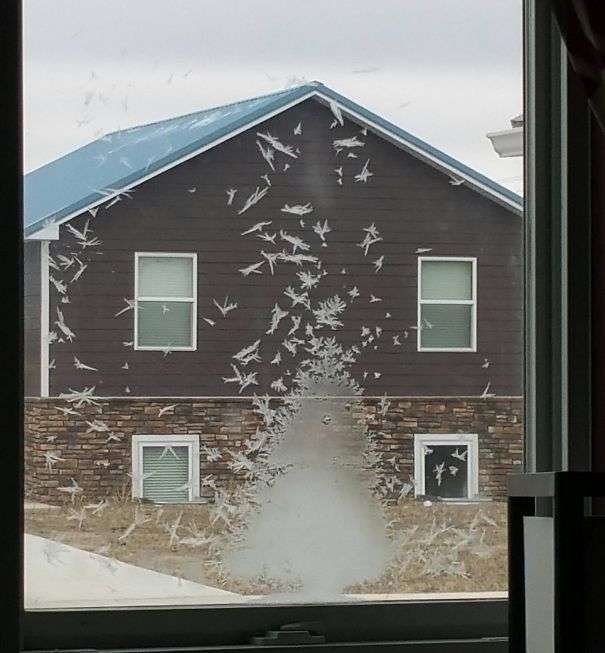 ▼​窗戶上的霜花很像飛離松樹的小鳥。