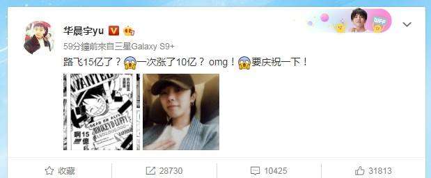▼連中國歌手華晨宇也都在自己的微博上發文表示:「魯夫15億了?一次漲了10億?OMG!要慶祝一下!」