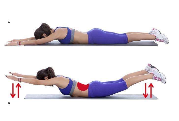 首先如圖平行躺下,手臂和雙腳伸直,接著將手臂、腿部和胸部都抬起來,模仿超人起飛的樣子,維持20秒後回到初始位置。建議重複做3次,每次休息20至30秒。