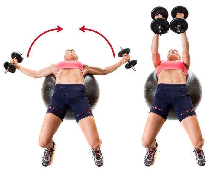 首先將背部放在穩定的球體或長凳上,雙手握著啞鈴打開胸口,接著將啞鈴舉到最高處,慢慢回到起始位置,建議持續60秒,重複3次,每次休息20至30秒。