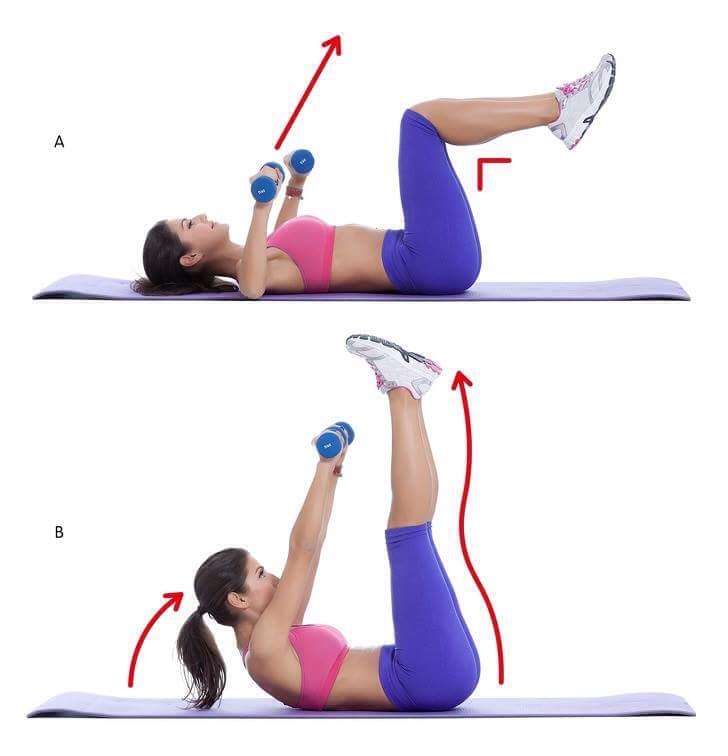 首先躺下,啞鈴平舉在胸部部位,雙腳踡縮保持90度,接著將雙臂伸直,同時抬起肩膀和伸直雙腿,返回起始位置後繼續進行約45秒,重複3次,每次休息20至30秒。