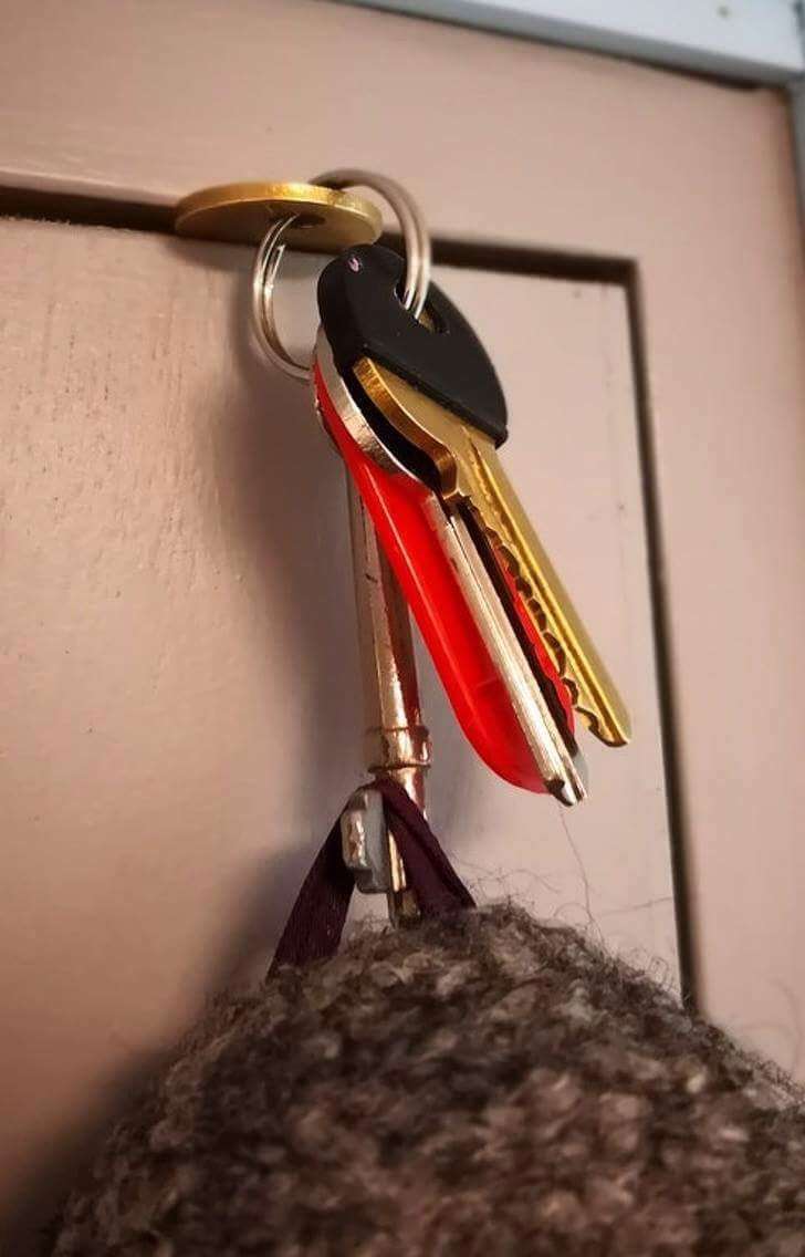 ▼租房子沒有掛鉤讓你掛包包嗎?利用鑰匙可以解決這個問題。
