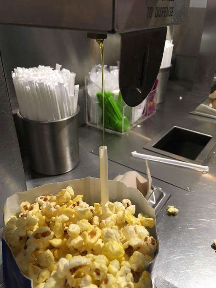 ▼爆米花中插入一根吸管,讓奶油可以沾到爆米花中央部分。