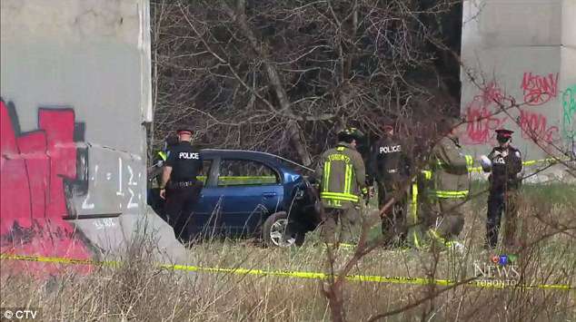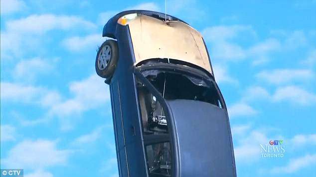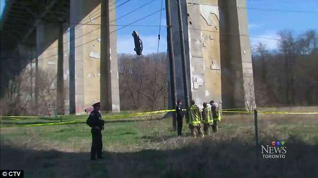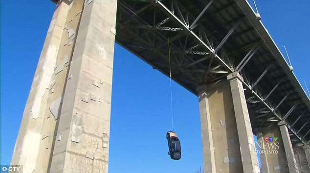 2018年05月05日近日,從多倫多Millwood Overpass大橋發生了觸目驚心的一幕,一輛藍色的轎車用一根纜繩吊在半空中,還不停搖晃,下面經過的路人都嚇壞了,生怕繩子斷裂,車子從上面掉下來。