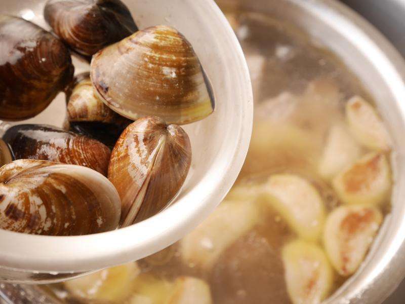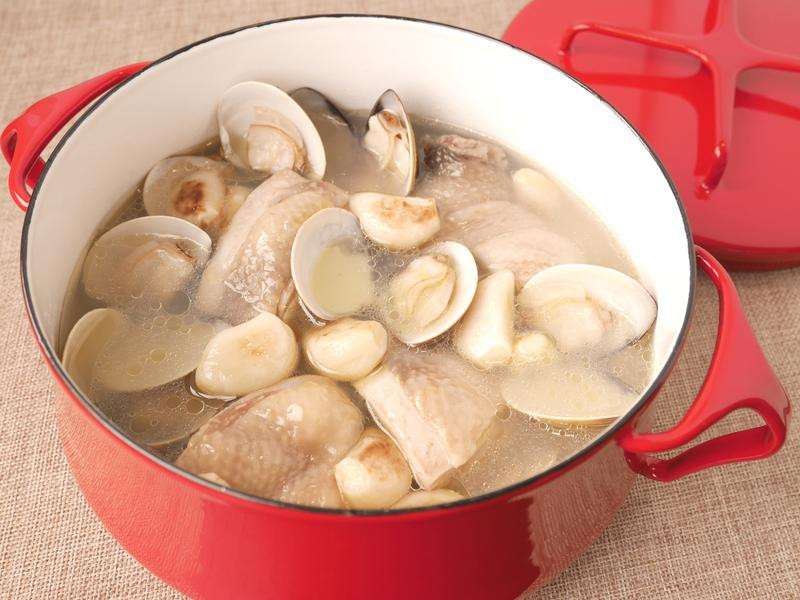 ▼蒜頭經過水煮會散發出絲絲甜味,讓雞湯更加美味。買蛤蜊時一定要買吐過沙的,這樣才不會影響口感: