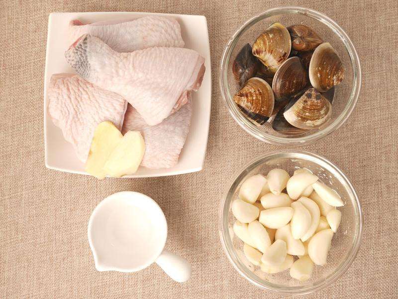 ▼先準備好食材,下面以一家三口的量為例:土雞腿一根洗淨切塊,三分之一雞腿數量的蒜、半斤蛤蜊、一小片生薑、半勺米酒、四分之一勺鹽巴、一升水。