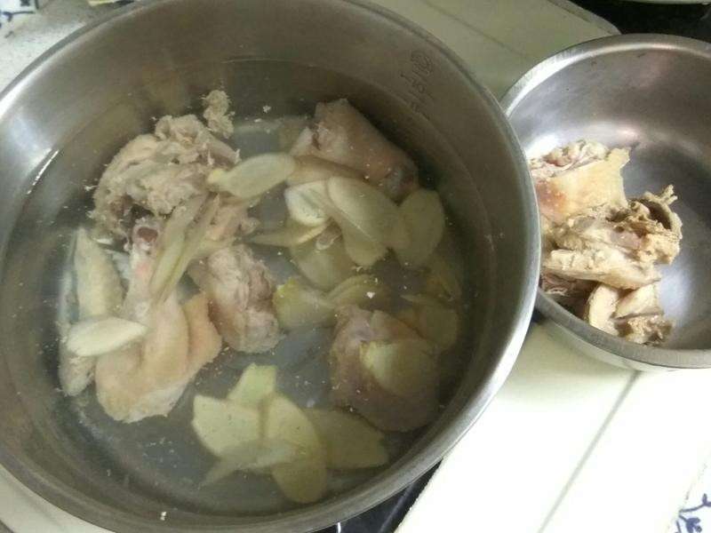 ▼湯鍋中加入水大火燒開,放入薑片和雞腿燒開。
