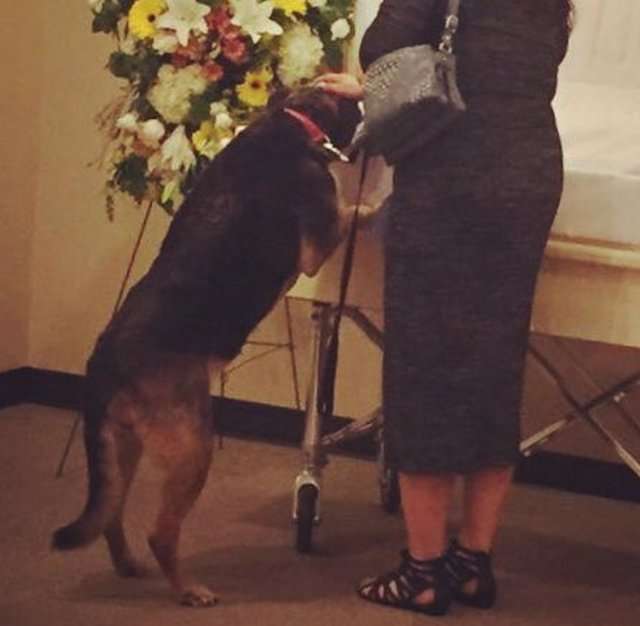 ▼10天之後,家人幫爸爸舉辦了葬禮,家人知道Sadie很愛爸爸,就破例讓牠參加。那天Sadie跟著媽媽來到棺材前,終於見到了好久不見的爸爸。牠非常激動,立刻跳起來趴在棺材上,搖著尾巴悲鳴,看起來很悲傷。