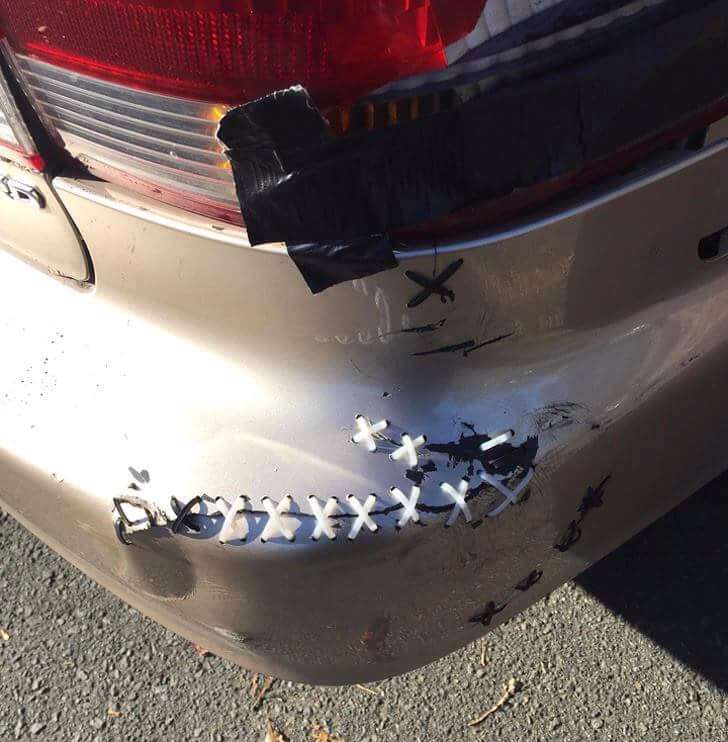 ▼發生車禍後,可以用束帶將防撞桿暫時「縫補」起來。
