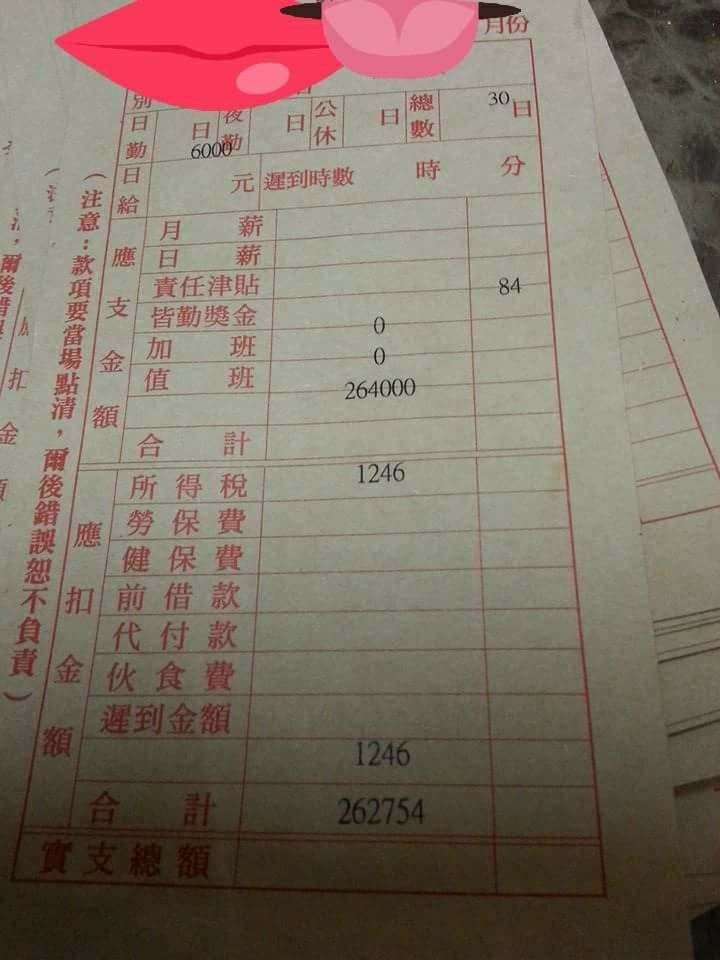 ▼從照片中可以看到,薪資單左上角寫著日勤「1日6000元」,應支金額「264000」元,扣掉所得稅1246元,還剩下26萬2754元。