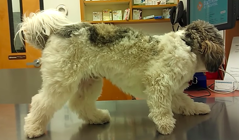 ▼這隻狗狗來到獸醫院後,大概太害怕了,就像恐怖片主角一樣僵硬在原地,不知道該怎麼辦。