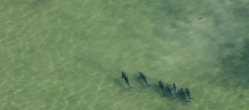 ▼海豚是群居的鯨類水生哺乳動物,牠們一起遊到了海中比較淺的大陸棚區。