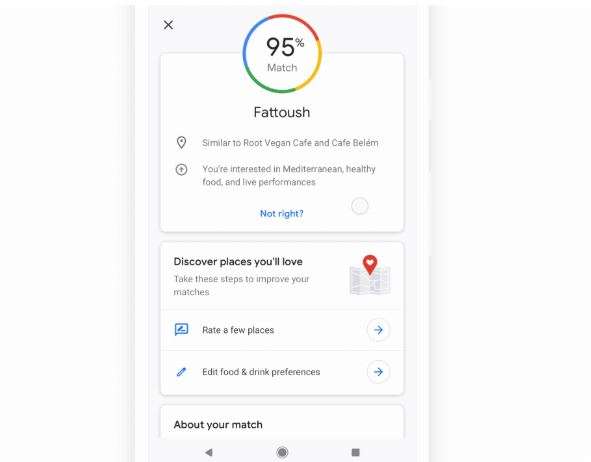 Google將針對個人喜好,依照過去搜尋習慣,整合地圖上專屬推薦地點,以後只要用戶在地圖上搜尋關鍵字,地圖上便會出現符合自己所需程度的「Your Match」功能,甚至可以使用「Lists」功能,將喜歡的項目蒐集進去,並與好友分享。