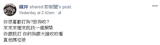 ▼這段影片曝光之後,「館長」陳之漢也生氣了,直接在臉書發文點名:「你很喜歡打狗?放狗咬?來來來哩來我,找一個房間,你跟我打,你的狗跟大雄咬咬看,真他媽垃圾」。