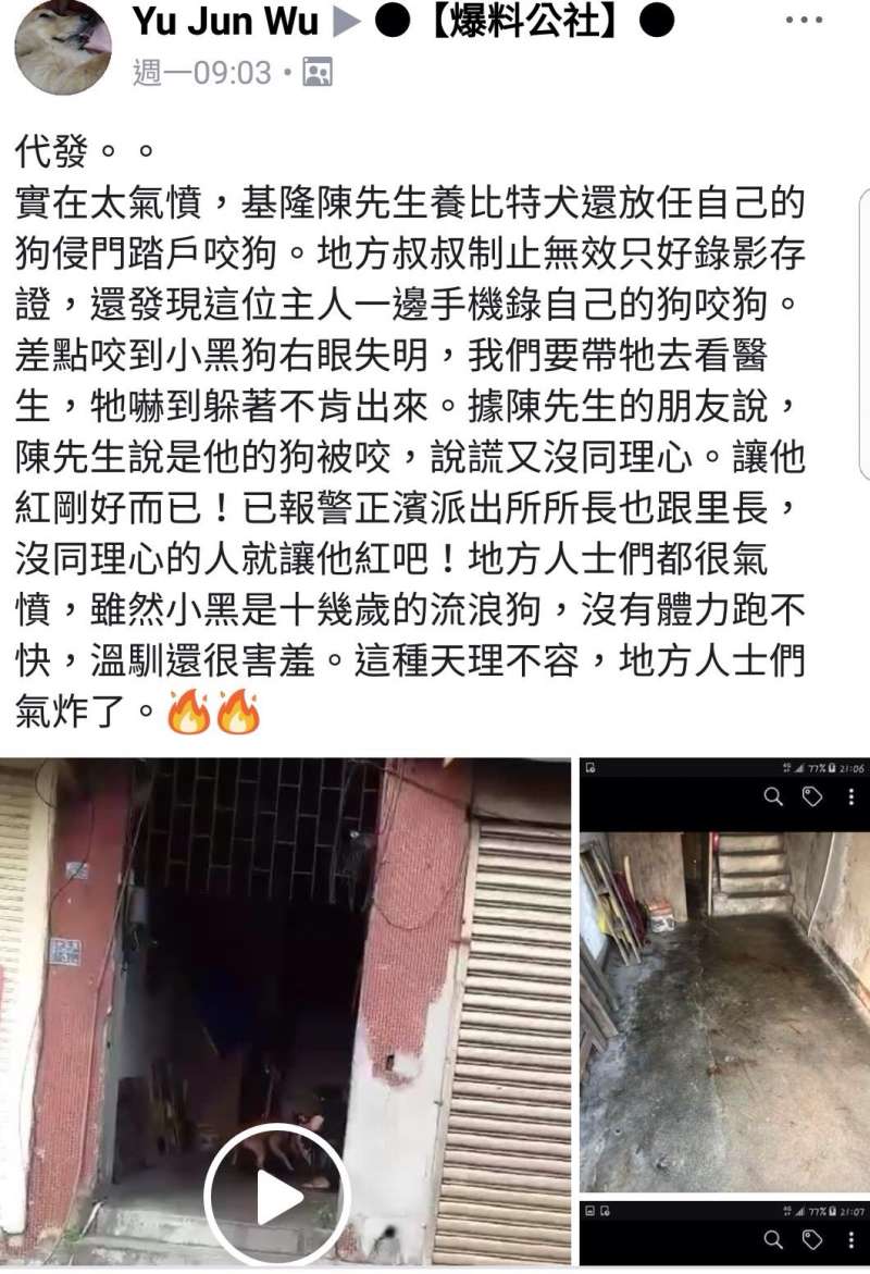 2018年05月17日日前有網友在臉書《爆料公社》分享了一件令人痛心的行為,原來基隆一名陳姓的飼主竟然帶著自己養的比特犬去攻擊一隻流浪狗,不僅在旁邊用手機拍攝還大喊「給牠死」,殘忍行為令人不忍直視。