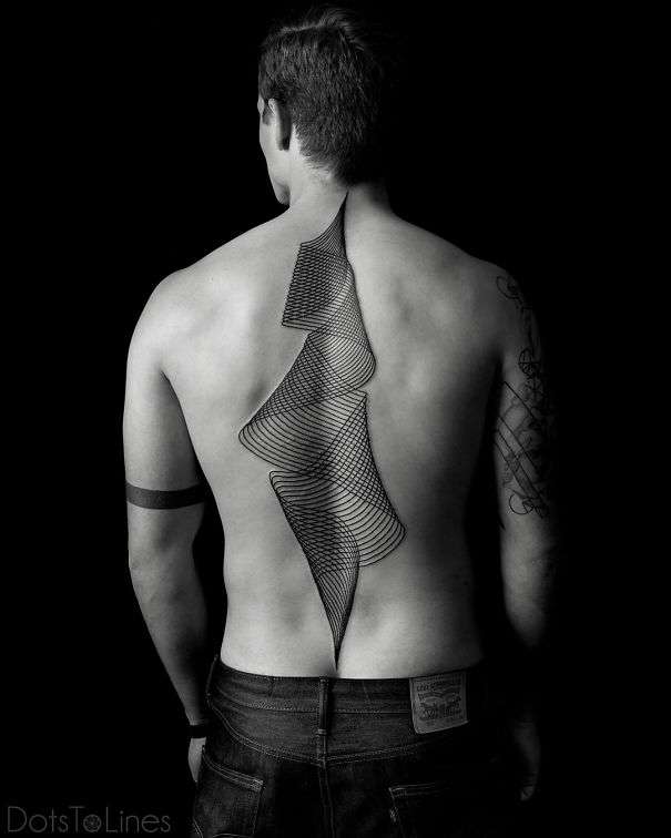 ▼剛直的幾何圖案,在女性的脊背上變得柔美自然。