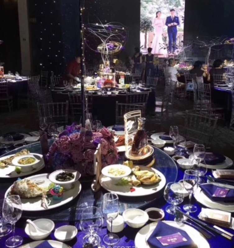▼除了華麗的會場,上桌的菜色也一點都不馬虎,據說菜色都是鮑魚、龍蝦、松露、和牛等高價食材,一桌要價高達12萬台幣。據悉婚禮當天席開260桌,出席的賓客高達上千人,動用了超過300個工作人員、鮮花70萬多,而且賓客完全不用準備禮金,新人還給予他們每人2000元人民幣(約新台幣9000元)的紅包沾喜氣,真的令人羨慕不已!