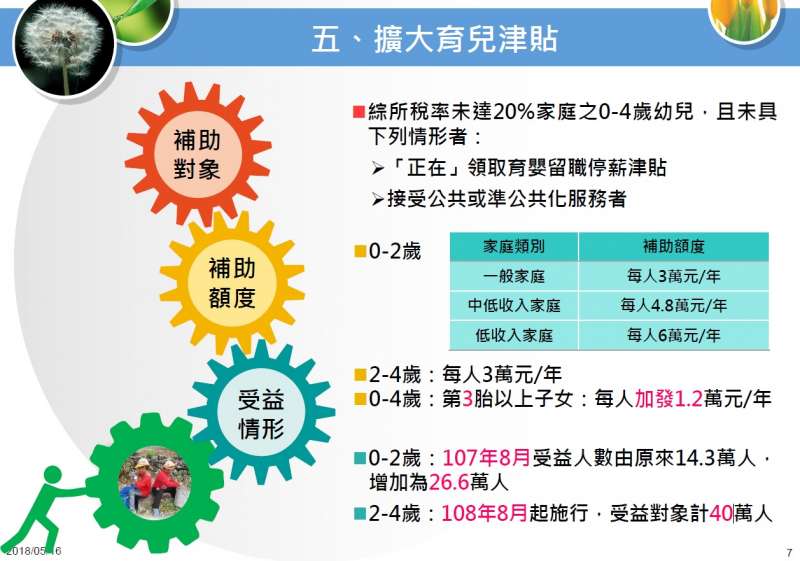 0到2歲育兒津貼方案於107年8月實施,受益人數由原來的14.3萬人增加為26.6萬人,0至4歲育兒津貼將於108年8月實施,預計受益對象約40萬人。