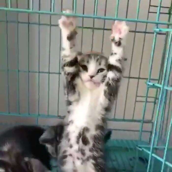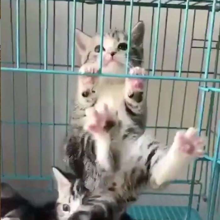 ▼影片中可以看到,主人打開籠子用玩具在外面逗小貓們玩,而有一隻虎斑貓兩隻前爪抓著籠子上方,仿佛在拉單杠時的將身體撐了起來。