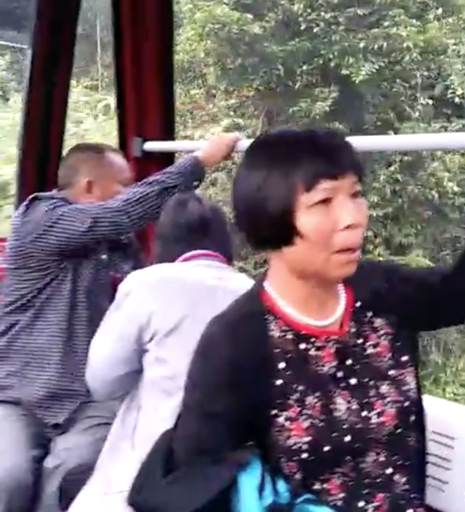 ▼畫面可見,一群阿嬤一同坐在纜車上,纜車周圍盡是一片樹海,搭配的背景音卻是阿嬤齊唱「阿彌陀佛」的聲音,每個人都面無表情地唱著,讓他相當尷尬!
