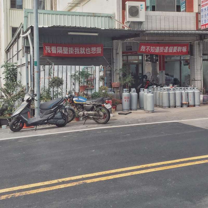 ▼那間瓦斯行門口掛著的大紅布條上,寫的不是促銷資訊,而是一句「我不知道掛這個要幹嘛」。隔壁鄰居也掛出了紅布條,上面寫著「我看隔壁掛我就也想掛」。兩間店好像在隔空對話,非常搞笑。