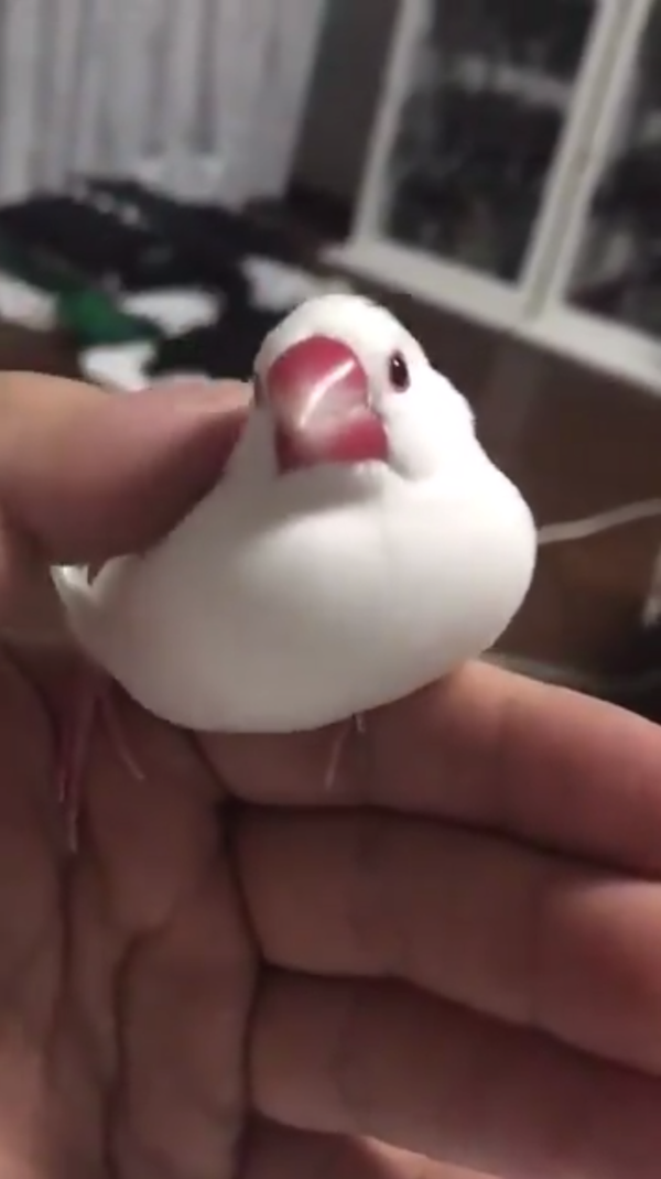 ▼這隻可愛的白文鳥乖巧地停在主人手上,而主人也用拇指搓揉牠軟綿綿的身軀,超像在摸麻糬!