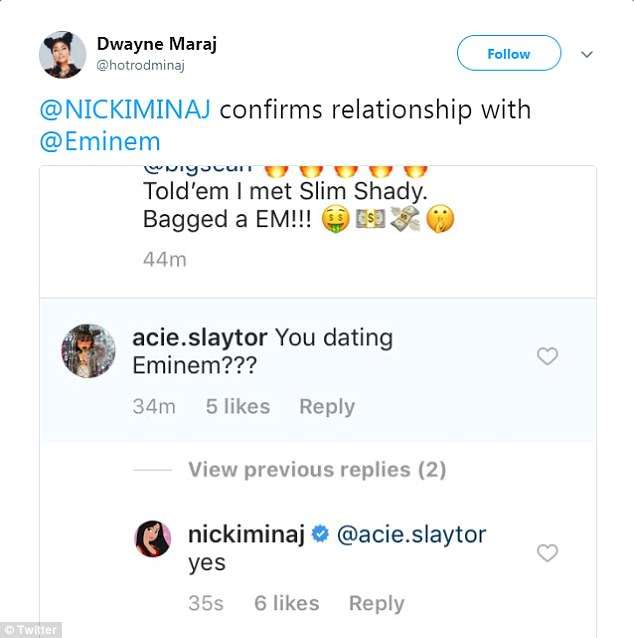 ▼妮琪米娜在IG上宣傳新單曲《BIG BANK》時,套用了阿姆(Eminem)歌曲《The Real Slim Shady》中的一句歌詞。這句話引起了粉絲們的關注,大家紛紛猜測她是否有了新戀情。一名粉絲留言問「妳是不是和阿姆在約會?」沒想到她竟然大方承認「是的!」