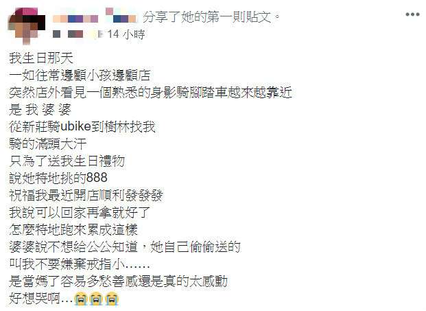 ▼網友在「爆廢公社」發文表示,生日當天,她一如既往邊帶小孩邊顧店,結果看到「一個熟悉的身影越來越靠近」,定睛一看發現是婆婆!