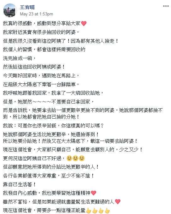 ▼當時王宥晴詢問「可是妳也很辛苦餒,妳這樣真的可以嗎?」,結果阿姨回答「那個阿婆生活比我更艱辛」,而阿姨自己還有能力可以撿。話一說完阿姨就騎著腳踏車,載著這袋回收去給那位阿婆了。以下是王宥晴在臉書所發的全文: