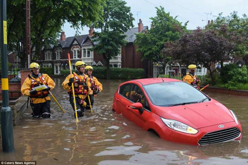 ▼因為暴雨傾盆,伯明罕的街道被洪水淹沒,消防員忙碌不堪。