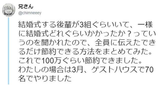 ▼這位名為「chimneeey 」的網友表示,因為有三個後輩跟他咨詢婚禮的費用,所以他索性將自己婚禮如何省錢的方法分享出來,還稱自己在今年三月舉辦的婚禮,邀請了70名賓客,用這些方法,省下了100萬日幣。