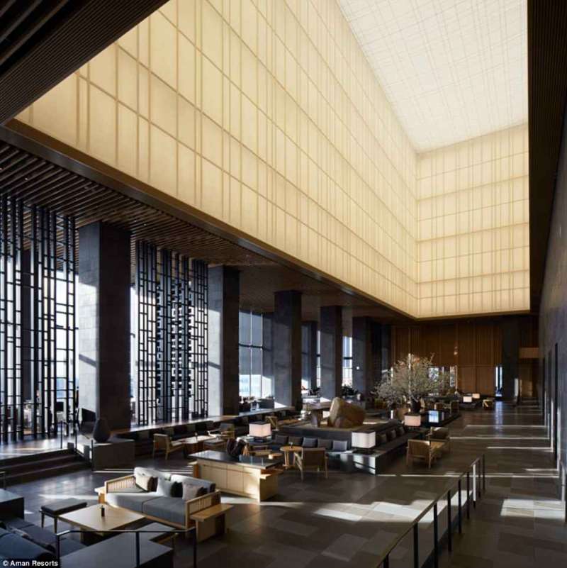 ▼東京阿曼酒店:這間酒店的大廳採用挑高設計,如同日本的紙燈籠。白天陽光會照進來,非常明亮,晚上則有精彩的燈光秀。